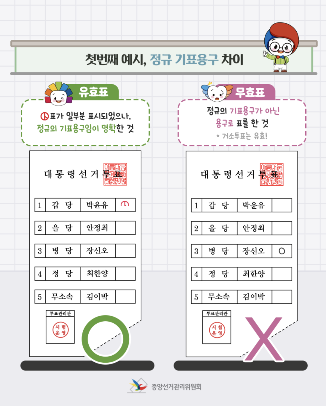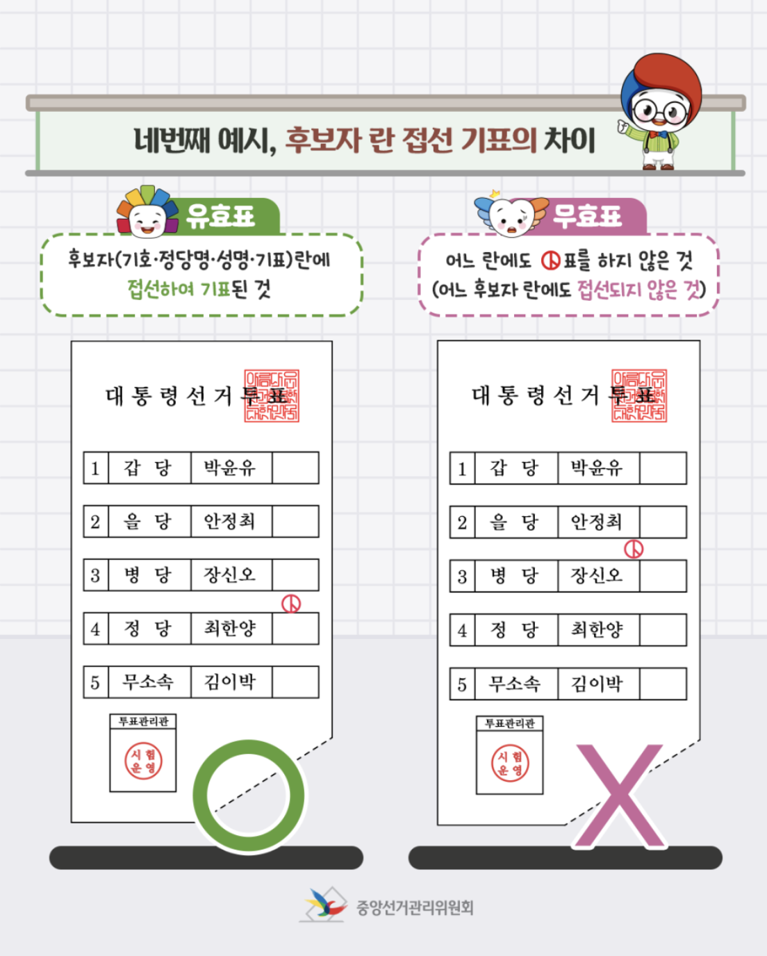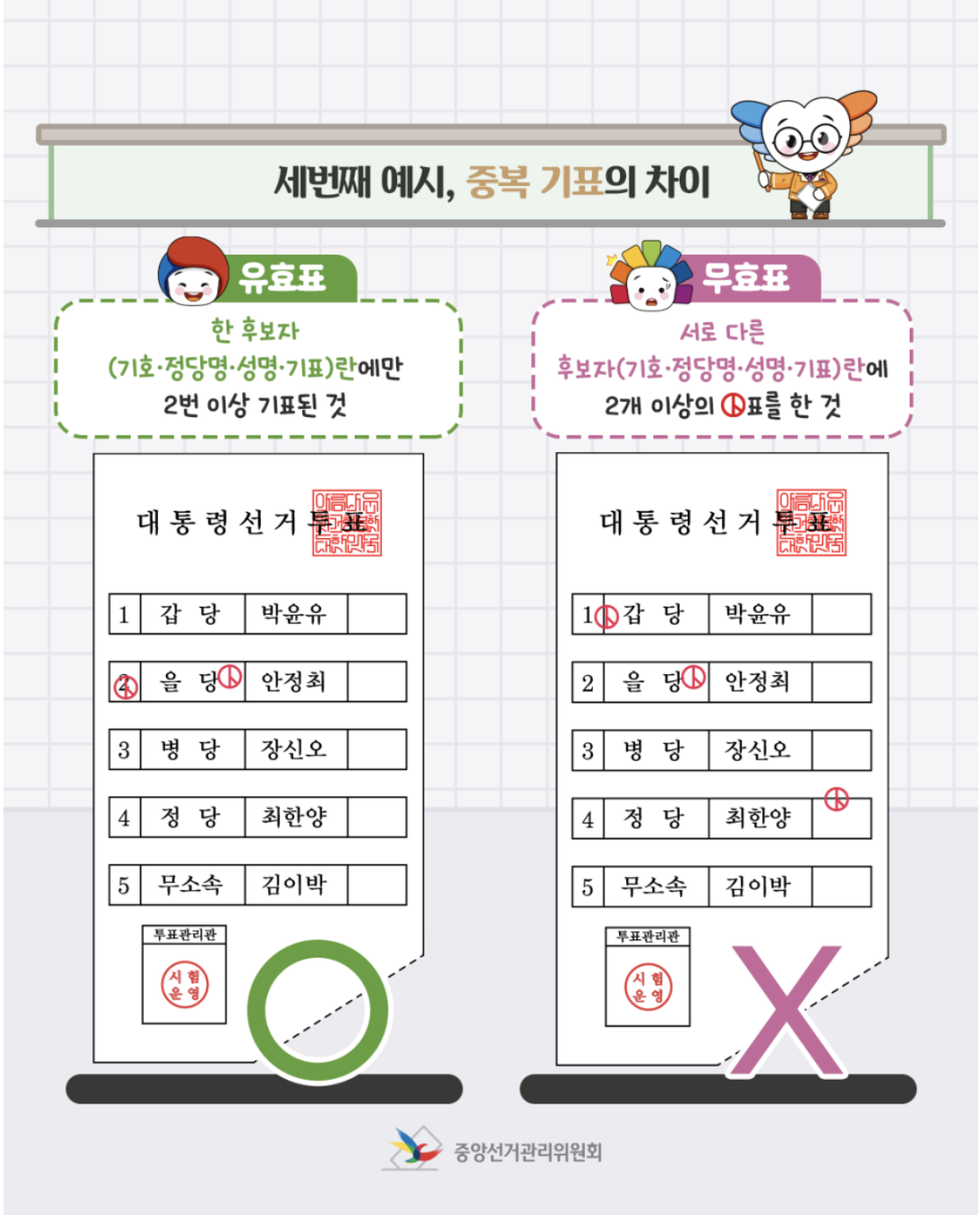 이처럼 작은 실수가 유효한 한 표를 무의미하게 만들 수 있으니 꼭 주의가 필요합니다.