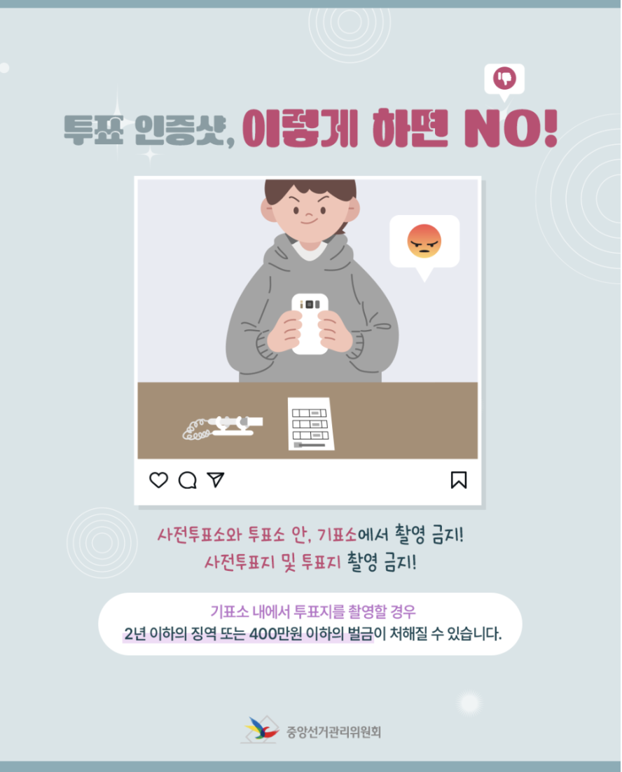 셀카, 투표지 인증샷 등은 기표소 내부에서는 절대 금지되어 있으며, 적발 시 처벌될 수 있습니다.