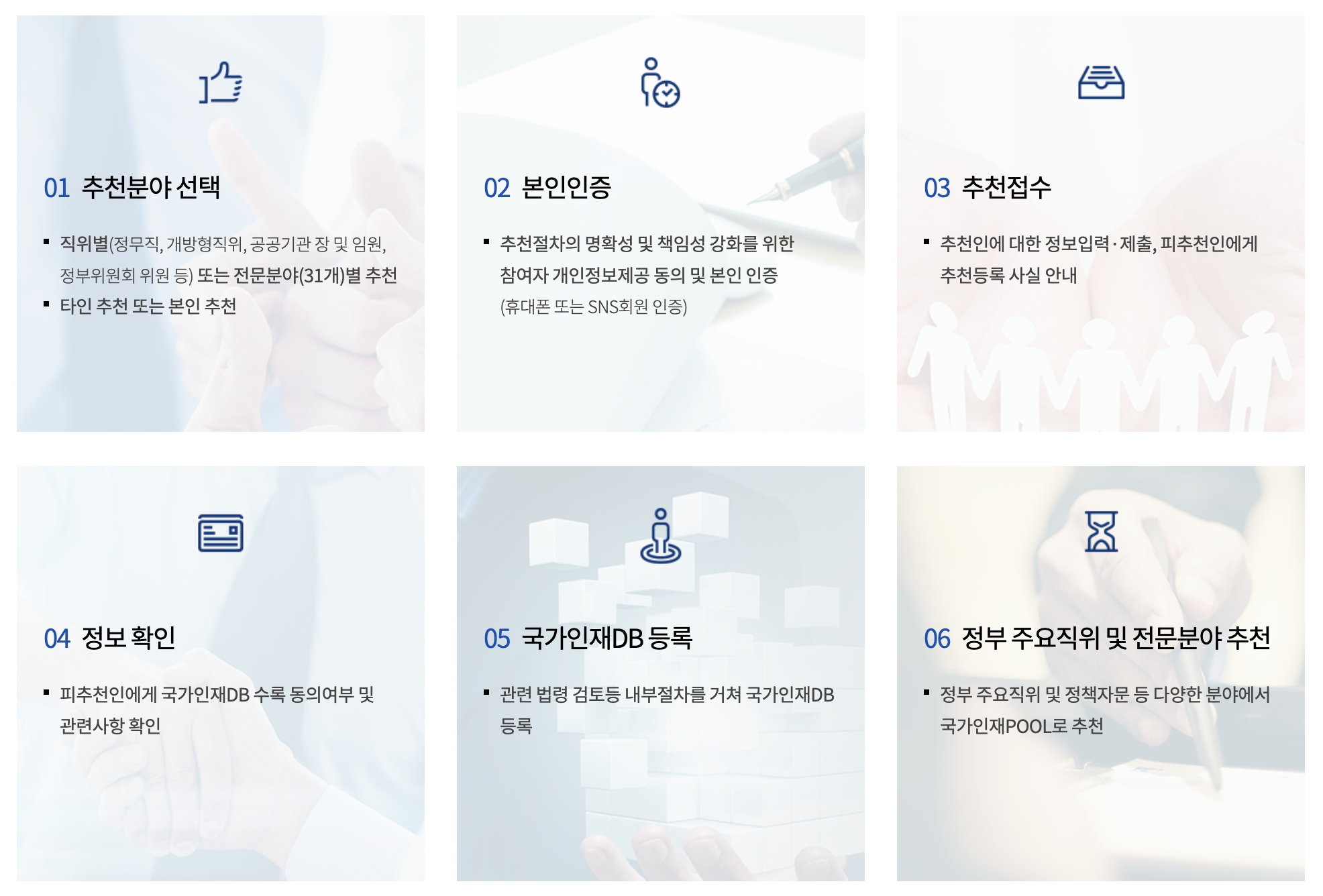 | 06. 주요직위 추천 | 정책자문, 주요직위 인재POOL로 추천 |